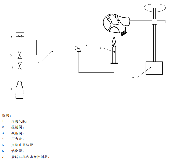 測(cè)試原理:將被測(cè)試樣佩戴在金屬頭模上,調(diào)整金屬頭模高度,使燃燒器頂端與面罩最下端垂直距離為20mm,然后使金屬頭模位于燃燒器燃燒范圍外。點(diǎn)燃燃燒器后,調(diào)節(jié)燃燒器火焰,使燃燒器火焰高度達(dá)到40mm,使距離燃燒器頂端20mm處的火焰溫度達(dá)到800℃。啟動(dòng)金屬頭模運(yùn)動(dòng)控制裝置,使被測(cè)試樣經(jīng)過燃燒區(qū),記錄通過火焰上方時(shí)面罩材料的燃燒情況。